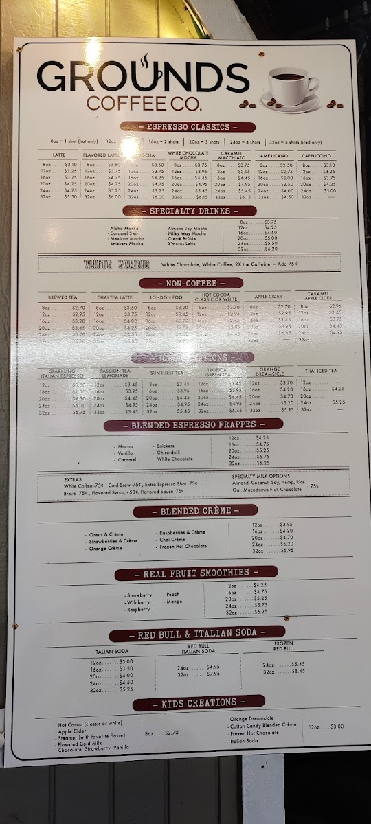 The menu at Grounds Coffee Co. offers a thoughtfully curated selection designed to complement its relaxed espresso bar atmosphere. You’ll find classic espresso drinks like lattes and cappuccinos alongside comforting brewed teas and cozy options such as the London Fog. For those looking for something refreshing, iced creations like the Orange Dreamsicle and Sunburst Tea provide a light, bright choice to enjoy during warmer moments of the day.